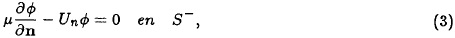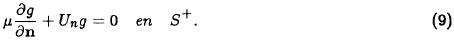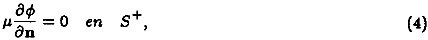 La frontera S se ha dividido en dos partes dependiendo de si el flujo entra a D o sale, es decir, S+ se define como los puntos de S tal que Un = U ⋅ n ≥ 0, donde n es el vector normal exterior y S− se define como el complemento (Un =U ⋅ n< 0). La condición de frontera (3) dice que cuando el viento ingresa a D, el flujo total del contaminante tomando en cuenta difusión y advección es igual a cero, por lo cual en S− no hay salida de la especie contaminante. La condición de frontera (4) dice que cuando el viento sale de D se desprecia el flujo difusivo turbulento en comparación con el flujo advectivo del contaminante. Estas condiciones de frontera fueron definidas por Marchuk (1986) y generalizadas al caso de tres dimensiones por Skiba (1993).