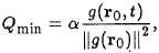 Una tasa de emisión Q tal que (g(r0),Q) < α, puede restringir significativamente la producción de una empresa, por lo cual es mejor para la industria buscar Q tal que (g(r0),Q) = α. Este último problema también tiene una infinidad de soluciones, y algunas de ellas aun cuando mantienen niveles de contaminación aceptables en Ω, pueden tener fuertes emisiones en r0 y dañar con esto una vecindad de este punto. Para evitar esto se deben hallar aquellas tasas de emisión Q que liberen la menor masa contaminante entre aquellas que cumplan (g(r0),Q) = α. Como más adelante se muestra este problema tiene solución única y se denota como Qmin.