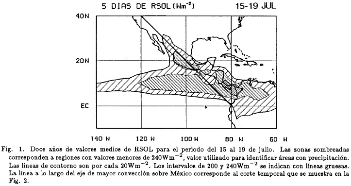 La Figura 1 representa regiones con valores medios de RSOL menores de 240Wm−2, un umbral frecuentemente utilizado para identificar áreas con precipitación en las zonas tropicales (Rasmusson et al, 1988; Murakami and Matsumoto, 1994; Wang, 1994). Esta figura muestra el patrón de convección durante la segunda mitad de julio, el cual se extiende hasta mediados de agosto. Dicho patrón se caracteriza por la marcada asimetría sobre la parte norte del país, pues mientras que un eje de nubosidad se ha desarrollado sobre la Sierra Madre Occidental, un centro cerrado de altos valores de RSOL sobre el noreste (no se muestra), indica condiciones de cielo despejado.