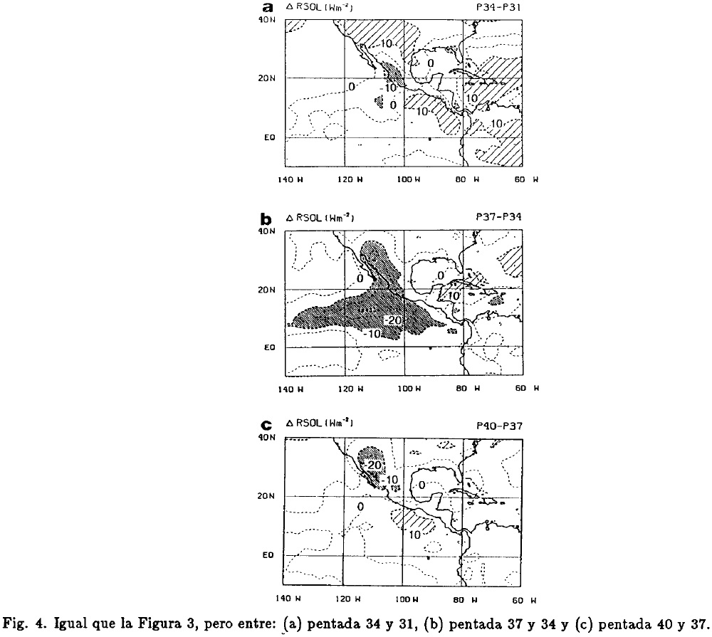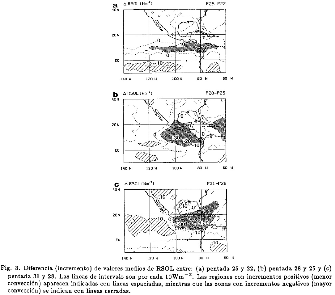 La Figura 3 representa la diferencia (incremento) de valores medios de RSOL entre: (a) pentada 25 y 22, (b) pentada 28 y 25 y, (c) pentada 31 y 28. Debido a que en los trópicos la RSOL presenta una correlación negativa con la cubierta nubosa (Morrissey, 1986), incrementos negativos de RSOL identifican zonas donde la convección (nubosidad) tiende a aumentar, mientras que áreas con incrementos positivos, corresponden a regiones donde ésta tiende a disminuir.