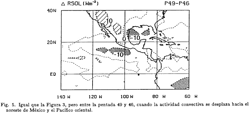 El aspecto más destacado para finales de mayo y principios de junio es el contraste entre la zona este y oeste del meridiano de 100°W (Fig. 3c), pues mientras en la primera se tiene un súbito incremento en la convección (América Central, sur de México y el Caribe) indicado por incrementos negativos de RSOL de −30Wm−2, incrementos positivos al oeste de este meridiano sugieren una disminución de la misma. Otras regiones donde la convección tiende a disminuir incluyen la cuenca del Amazonas, la costa noroeste del Golfo de México y el suroeste de los Estados Unidos. Es de notar que los incrementos positivos sobre la última región, están más relacionados con un incremento de la temperatura en superficie sobre la zona desértica, que con una disminución en la convección. Un aspecto más a destacar durante este periodo es que la zona de incremento en la convección se extiende sobre las Grandes Antillas, asociado a un máximo secundario en la actividad de ciclones tropicales (McBride, 1996). El mismo patrón se observa también en los análisis de valores medios de RSOL (Cortez, 1999).