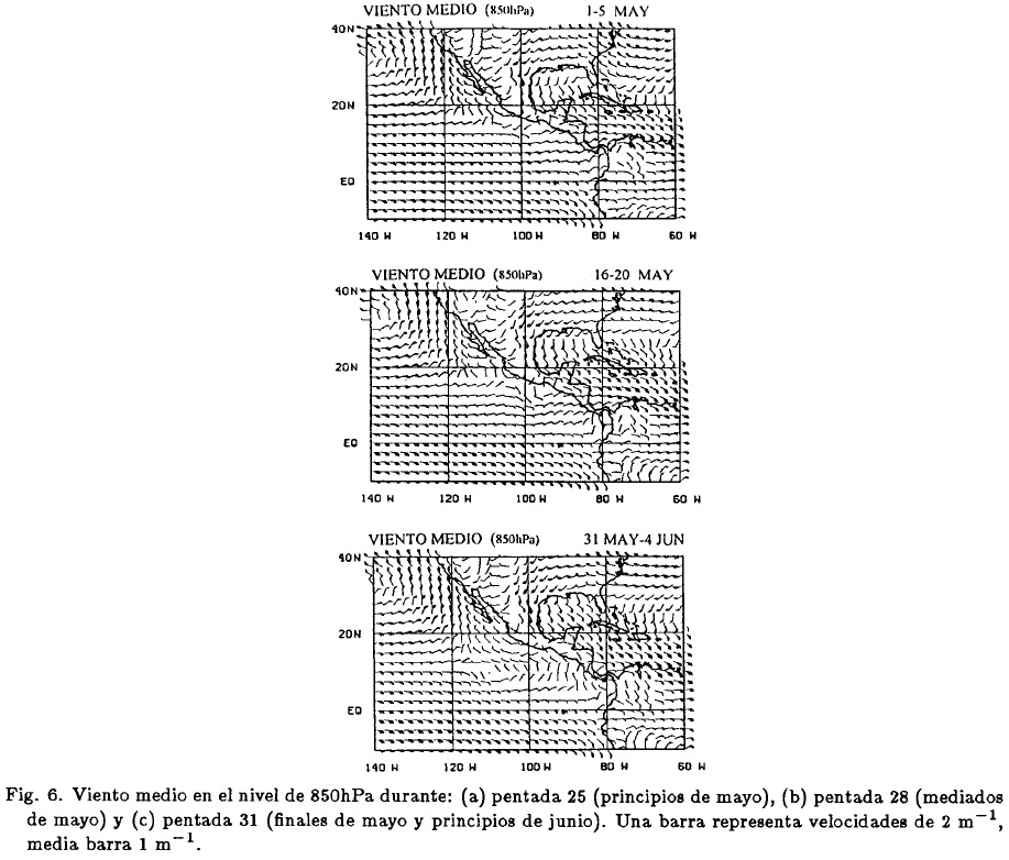 A lo largo del año, la circulación sobre el área de estudio es fuertemente influenciada por los centros de alta presión subtropical del Atlántico y del Pacífico. Conforme el verano se aproxima, estos centros de alta presión se intensifican y se desplazan con dirección oeste. Un cambio a finales de abril y principios de mayo (Fig. 6a), precursor del inicio de la estación de lluvias sobre el centro/sur de México, es la intensificación de los vientos del este sobre el Caribe, los cuales toman un giro anticiclónico en el Golfo de México y penetran al noreste de México y Texas como vientos del sureste. Durante este mismo periodo, los vientos del este sobre América Central y el Pacífico oriental se debilitan (Fig. 6b). En el Pacífico norte, vientos del noroeste se observan a lo largo de la península de Baja California hasta más al sur de 20°N.