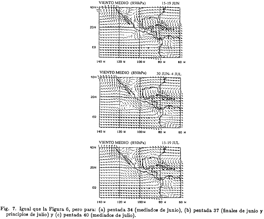 Un aspecto interesante en la Figura 9b es la intensificación del flujo procedente del Hemisferio Sur, centrado a lo largo de 100°W, el cual es más visible en el nivel de l,000hPa (no se muestra). Este aspecto apoya los resultados de Reyes y Cadet (1988), quienes sugieren el transporte de humedad desde el Hemisferio Sur hacia el noroeste de México y lo relacionan con una intensificación del alta subtropical del Pacifico sur. Notablemente, durante el periodo de principios de junio y hasta mediados de julio, los mapas muestran una intensificación en los vientos del sur que entran y soplan a lo largo del Golfo de California, en mayor acuerdo con los análisis de Douglas et al. (1993).