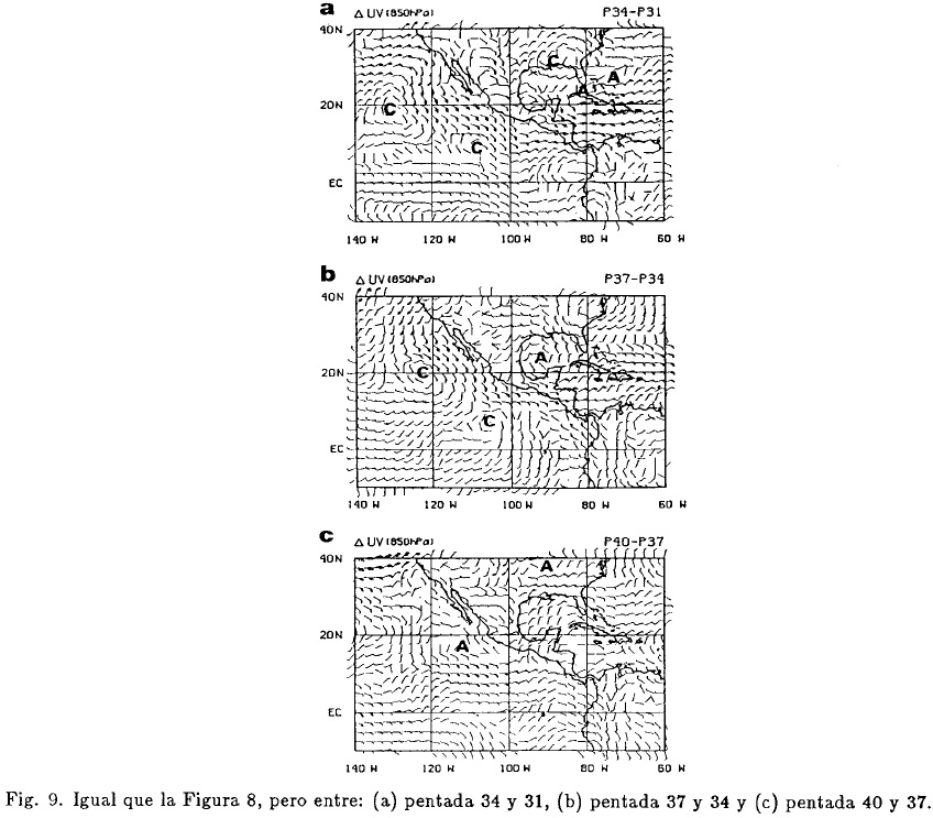 La anterior variación estacional norte/sur es acompañada por una variación en la intensidad de los vientos del este sobre el Pacífico oriental, en la región entre 5°y 15°N, en donde los vientos ecuatoriales del oeste se intensifican a finales de abril (Fig. 8a), cambio también visible en el flujo medio de l,000hPa. A mediados de mayo (Fig. 8b), un centro "C" cerca de 10°N y 105°W, sugiere una intensificación en la convección, en buen acuerdo con la Figura 3b que muestra los mayores incrementos negativos de RSOL sobre la misma zona. A finales de mayo y principios de junio (Fig. 8c), los vientos del oeste toman un giro ciclónico sobre América Central y el Caribe. Dos centros "C" se forman durante este periodo a lo largo de 20°N, estas celdas "C" están inmersas dentro de una zona de intensa convección (Fig. 3c) y por lo tanto son de origen convectivo. Cuando estas dos celdas se combinan, tienden a formar un gran centro de circulación ciclónica sobre el Pacífico oriental y centro/sur de México, con vientos ecuatoriales del oeste cerca de la superficie en su parte sur.