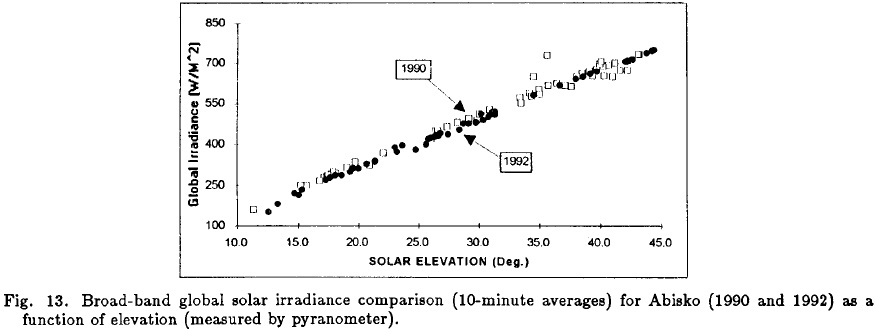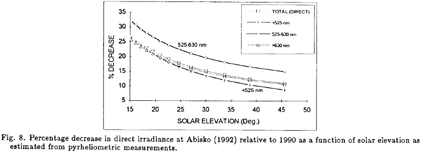 Mediciones de radiación solar en banda ancha y espectrales se llevaron a cabo discontinuadamente entre 1990 y 1994 en Abisko (68°21' N, 18°49' E) ubicada a 200 km al norte del Círculo Polar Artico en Suecia septentrional. El aumento en la turbiedad atmosférica debido a las enormes cantidades de aerosoles volcánicos que fueron inyectados dentro de la estratosfera por las erupciones del Monte Pinatubo, en junio de 1991, condujeron consiguientemente, a una reducción en la irradiancia directa que es considerable en la gama visible, variando de 18 a 30 % a las alturas solares de 40° a 15°, respectivamente.