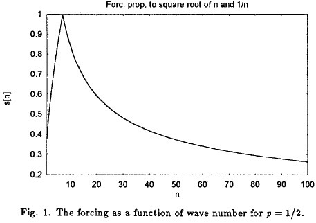 The -3 law for the logarithmic distribution of the kinetic energy in wave number space is found only when one considers the averaged kinetic energy for considerable lengths of time intervals. On individual days considerable deviations may be found. We should therefore also consider the specification of the forcing S[n] given in (2.4) as such an time-averaged distribution. It is thus of interest to investigate the logarithmic slope for other distributions of S[n]. Figure 9 shows three examples of distributions obtained by varying the exponent (p) from the value of p = 1/2 used in the above considerations. It is noticed that a smaller value of p results particularly in larger values of the forcing for the larger wave numbers, while the opposite is the case for larger values of p. Varying p by 0.05 from 0.3 to 0.7 the logarithmic slopes of the kinetic energy have been calculated for the small and the large wave numbers. The results are listed in Table 1 where the slopes are given separately for the long (L.W.) and the short waves (S.W.).