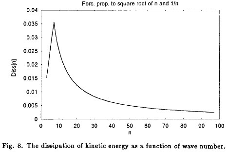 The model should also result in a balance between the conversion from eddy potential to eddy kinetic energy, the nonlinear cascade of kinetic energy in the spectrum and the dissipation for each wave number. As can be seen from Figure 7 the conversion from eddy potential to eddy kinetic energy balance each other almost exactly, implying that the dissipation plays a minor role in the balance. This can be seen from Figure 8 displaying the dissipation of the kinetic energy. It is between one and two orders of magnitude smaller that the energy conversions shown in Figure 7.