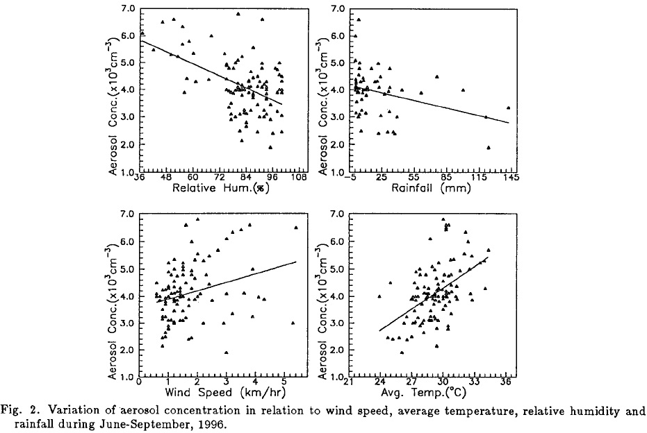 The observations on meteorological parameters like temperature, wind speed, relative humidity and rainfall and aerosol concentration have been shown in Figures 1 and 4 for the monsoon and winter season respectively. The variation of aerosol concentration with wind speed (WS), average temperature, relative humidity (RH) and rainfall (RF) are shown in Figures 2 and 5.