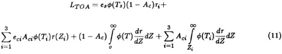 where ɸ(T) = σT4, es and eci are surface and cloud emissivities respectively. The first term on the right hand side represents the flux from cloud free area (1 Ac); the third and fourth terms stand for top of the atmosphere cloudless part and cloudy one respectively. The contribution of water vapor and aerosol are mainly involved in the LBOA as an portion of equation (11), including the first and second terms.