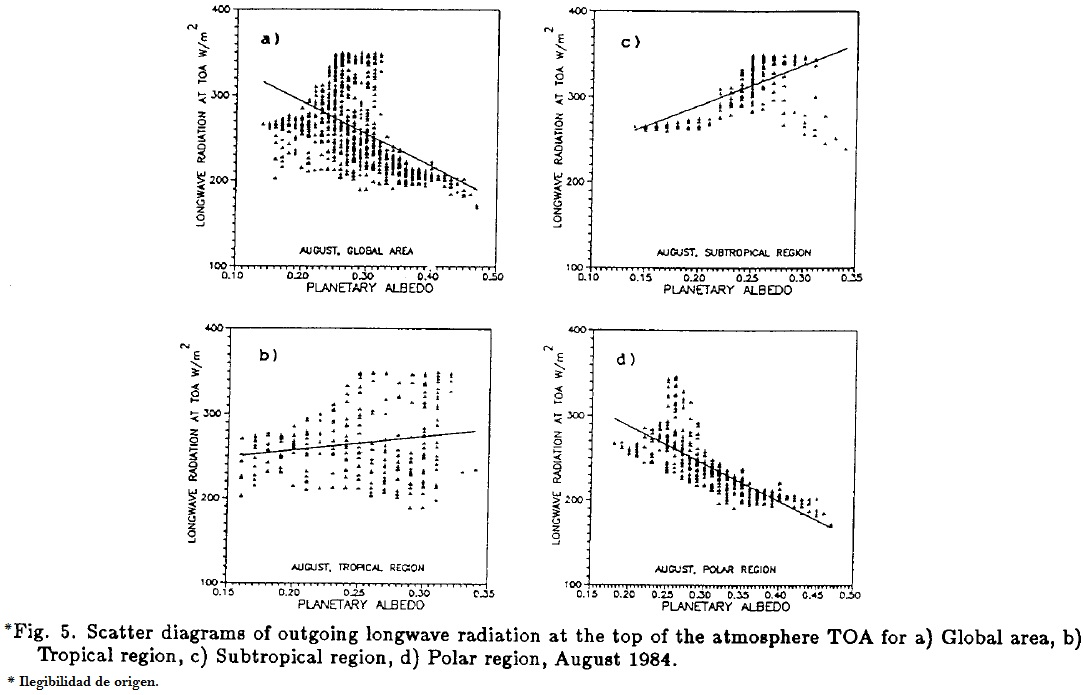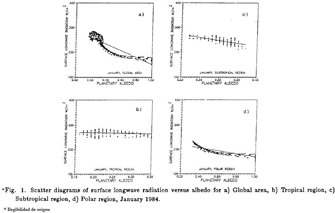 Hemos establecido una relación entre la radiación de onda larga neta y el albedo planetario en la superficie y en la alta atmósfera. Se encontró que hay una relación inversa entre la radiación de onda larga y el albedo planeterio, tanto en la superficie como en la alta atmósfera. Cambios latitudinales también fueron encontrados como un factor significativo, en adición al estacional en el comportamiento de esta relación. Este tipo de relación puede ayudar a entender los ciclos climáticos y explicar muchos problemas de balance de radiación.