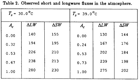 For single column cases for ΔSW and ΔLW are given on Table 2, has been derived from single column model, following Krishnamurti (1986). Two different cases: one with surface temperature 30°C and the other with 39°C are given for sake of comparison. The observed short and long wave flux in the atmosphere as given by equation (13) under different cloud conditions are recorded on Table 2.