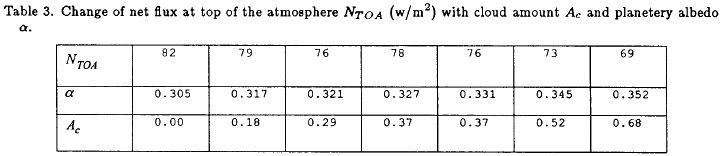 The change of the net flux at top of the atmosphere is given with cloud cover Ac and planetary albedo a on Table 3, which it has also been derived from the single column model.