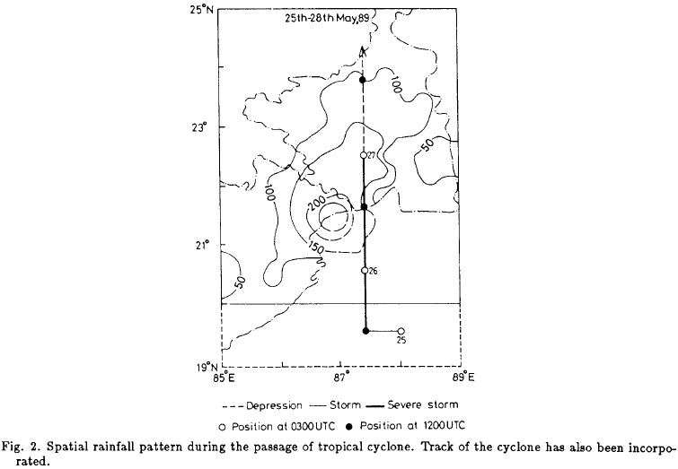 Examination of data for the twenty years period shows that in the premonsoon season only one tropical cyclone passed through the region during 25th - 28th May, 1989 (Mausam, 1990). As a result, a number of stations recorded heavy rainfall (Fig. 2). Since the premonsoon rainfall as a result of premonsoon thunderstorms is of great concern in this study, the amount of rainfall due to this cyclonic storm activity has been deducted while calculating the mean monthly rainfall for those stations. The difference in mean monthly rainfall (mm) in the two ten years periods has been calculated for all the stations for each of the premonsoon months (Fig. 3). The region near by Kharagpur, a station over the south eastern part of GWB, is well within the 30 mm contour showing significant decrease in mean monthly (March) rainfall in the later period (1983-92), which agrees with Lohar and Pal (1995).