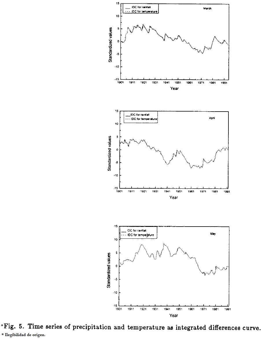 Abril y mayo tienen la misma tendencia, aunque no son estadísticamente significativos. La curva de diferencias integradas muestra, invariablemente una relación inversa entre la temperatura media y la precipitación.