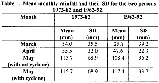 Analysis of rainfall data over the area under study shows a decreasing tendency of rainfall in the second period (1983-92) compared to the first ten years period starting from 1973. It is noted that in the month of March, the rainfall decreases significantly (about 52%) in the later period over a large area which includes station like Kharagpur. Due to the decrease in rainfall, the mean temperature increases by 0.7°C, which is quite significant for a period of 10 years long. The same tendency in rainfall is also followed in the months of April and May. In April, about 14% decrease in rainfall with 0.2°C increase in mean temperature are noticed, though the difference is not statistically significant. A slight decrease in temperature (0.2°C) is noticed in the later period in May unlike March and April. This may be due to the passage of the tropical cyclone through the region. From the daily rainfall data the cyclone affected days were excluded while they are not excluded from the mean monthly temperature data due to the unavailability of daily temperature data. Moreover, it has been noticed that rainfall in the later period increases when the rainfall amount due to the cyclonic storm is considered (Table 1), showing again the inverse associationship between the mean temperature and rainfall.