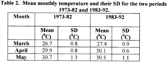Chi-square and Kolmogorov-Smirnov tests confirm the frequency distribution as Gaussian in case of temperature data series. The randomness of the time series for each of the premonsoon months, March through May, observed by Anderson test (WMO, 1966) and also through autocorrelation coefficient at 95% level of significance. The monthly mean and SD of the temperature in the two ten years period are shown in Table 2.