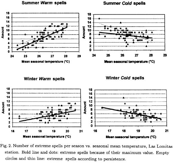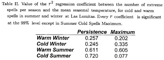 In order to examine the influence of extreme spells on seasonal averages, Figure 2 shows the number of extreme spells per season vs. mean seasonal temperature at Las Lomitas. As was to be expected, there is a direct relationship between the number of extreme (according to persistence or maximum value) warm spells and seasonal temperature, and an inverse relationship in the case of cold spells. As may be seen in Table II, where the r2 of regressions are shown, regression is more significant in summer, explaining in this case more than 60% of the variance for warm spells. In summer, persistence in cold spells shows the highest percentage (72%) and the highest slope, thus resulting in the most significant factor and involving synoptic conditions most relevant for the characterization of the seasonal temperature mean value. It is remarkable, however, that the maximum anomaly value in a cold spell does not condition summer temperature values: the slope is less steep and the correlation coefficient is less than 0.01 (not significant). This is due to the warming capacity of the dry air mass, resulting from an anticyclone coming behind a cold front. In winter, the percentages of variance explained by regression are lower, i.e., the relationship between the variables is weaken. Obviously, there are some other factors like radiative processes and cloudiness, which might inhibit low temperature persistence.