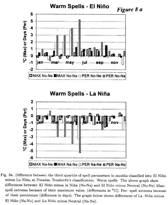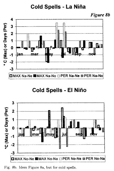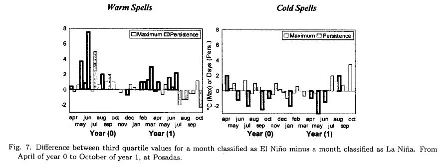 Extreme spell occurrence in northern Argentina is closely linked to the El Niño phenomenon. Winter warm spells are more persistent in an El Niño (0) year and more intense and persistent in the year following El Niño. In summer, however, there is either no difference, or the relationship is reversed, resulting in more intense situations in November and December in the case of La Niña. Cold spells reaching the northeastern most part of the country are more persistent when La Niña occurs, the conclusion being that the region would be affected by extreme cold spells when La Niña is active.