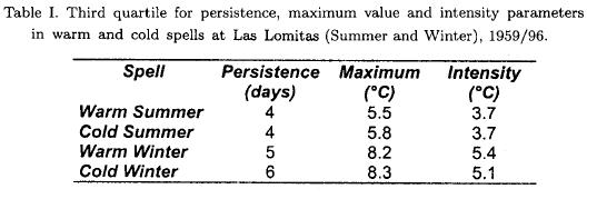 Surface temperature data measured at 2100 (local time) during the 1959/1996 period were used for this study. Spells had been defined as daily sequences of temperature anomalies having identical sign. Three parameters have been considered: the length or 'persistence', i.e. the number of uninterrupted days having the same anomaly sign, the 'maximum' in-spell value of the anomaly, and the 'intensity' computed as the average in-spell anomalies.