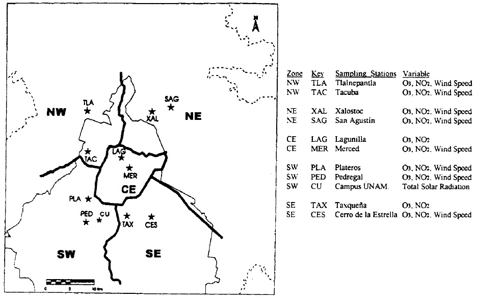 The data were obtained from 10 sampling stations selected from the Red Automática de Monitoreo Atmosférico (RAMA) (Atmospheric Monitoring Automatic Network), of the Gobierno del Distrito Federal (GDF). The stations were chosen in such a way that two of them were located in each of the five areas in which the MCMA is divided for the purpose of reporting air quality (NE, SE, SW, NW and CEnter or Downtown). The location of stations is shown in Figure 1. The examined period was the year of 1996.