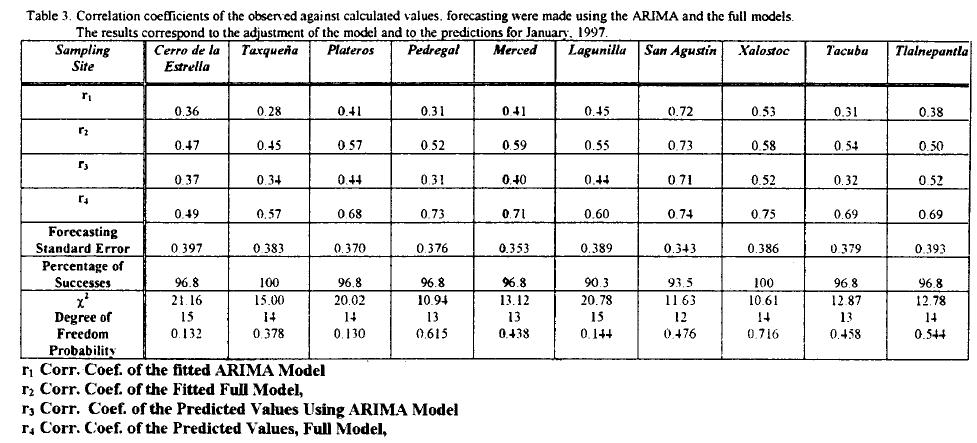 There are significant differences in the correlation coefficients for different stations. Using the data for the model fitting, corresponding to 1996, the correlation coefficients, r2, varied from 0.45 to 0.73, while for January, 1997, the data that were used for the validation procedure, r4 varied from 0.49 to 0.75. The most predictable values correspond to Xalostoc, San Agustin, Pedregal, Tacuba, Merced and Tlanepantla, these stations form a corridor stretching from northeast to west and then to the south. Center and southeast stations are the least predictable. This means that the factors used for forecasting explain more variability in the north and west parts of the study area. Southwest and Northwest of the MCMA show the highest ozone concentrations due to the fact that the industrial area of the city is located to the North and the pollution is transported towards the West and Southwest. The Southeast stations are located in rural and residential areas.