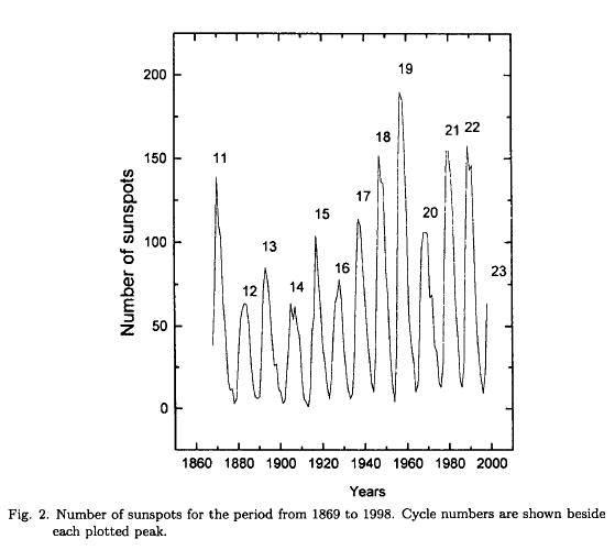 Thompson (1992) used the historical data to verify the results obtained with this method. He studied the maximum amplitudes of the solar cycles ranging from number 12 to 22 considering Eq. (1).