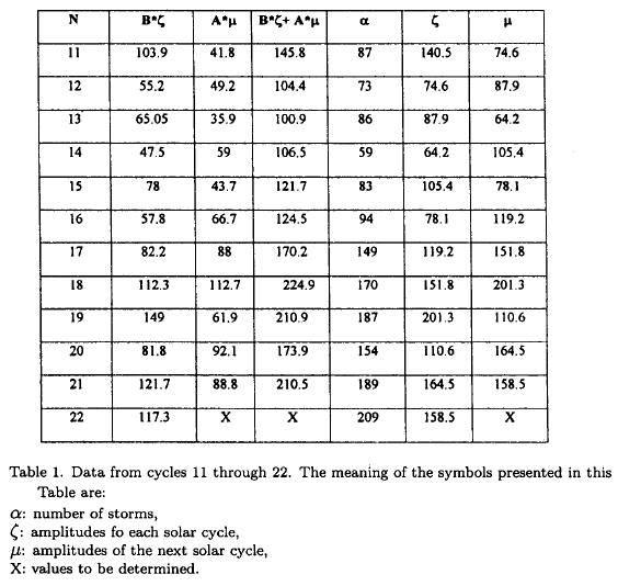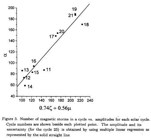 Where α is the number of magnetic storms, ζ the amplitude of the current solar cycle and μ the amplitude of the next solar cycle. The coefficient of the linear correlation turned out to be 0.977.