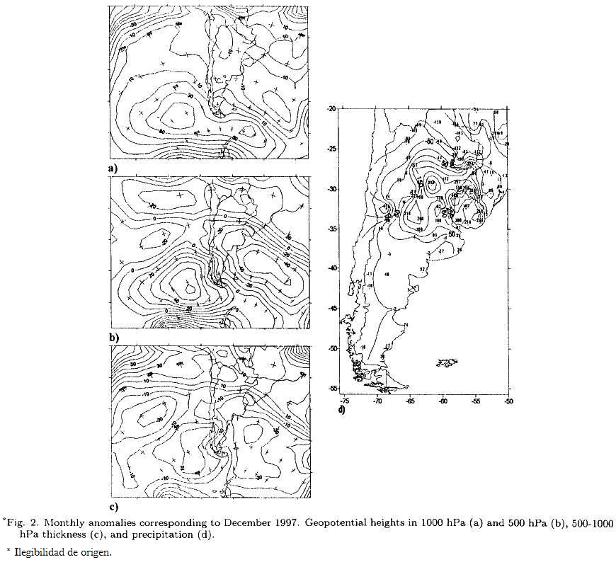 It can be seen in the Figures 3a, 3b y 3c that the main positive anomaly is located in the Pacific at approximately 50°S and 110 W, displaced toward the west compared to the its position in November. At 500 hPa a negative center is visible at 32°S and 100°W.