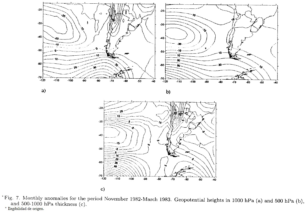 In 1000 hPa (Fig. 6a) greater differences can be observed. In the period 1982-1983, the Trade winds were weakened north of 30°S, a feature generally associated to El Niño conditions detailed by Philander (1990), condition that was not observed for the period 1997-1998, where the intensity of the Pacific anticyclone was enhanced (Minetti and Vargas, 1983; Minetti et al., 1993).