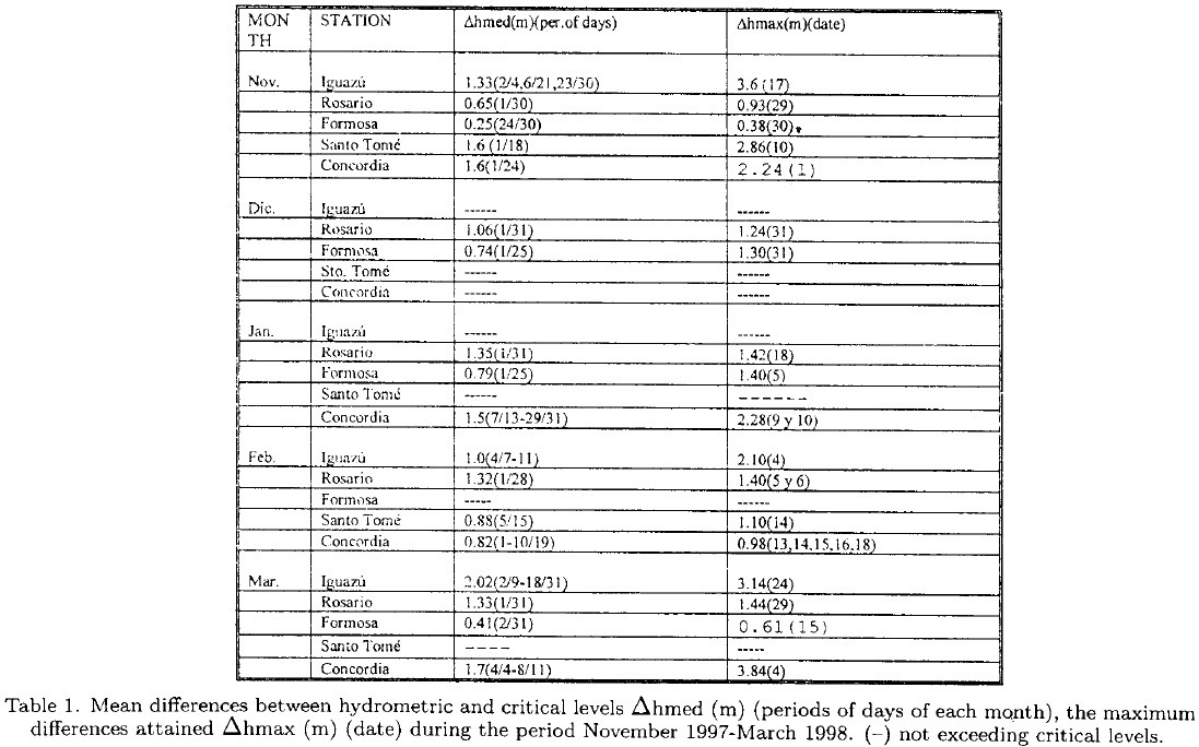 Beginning in October 1997 and until March 1998, intense and persistent rainfalls were registered producing flooding the rivers of the Río de la Plata basin, up to about 300% above the monthly mean, affecting the region socially and economically.