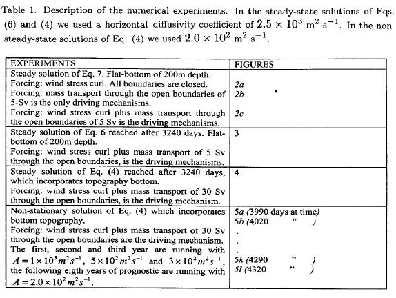 In Figure 2, we show the circulation patterns for different solutions of Eq. (7). Figure 2a shows that the curl of the wind stress establishes two anti-cyclonic gyres, one in the Caribbean Sea and another in the Gulf of Mexico. A weak cyclonic gyre is also observed in the Bay of Campeche.