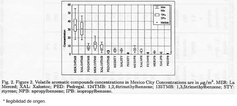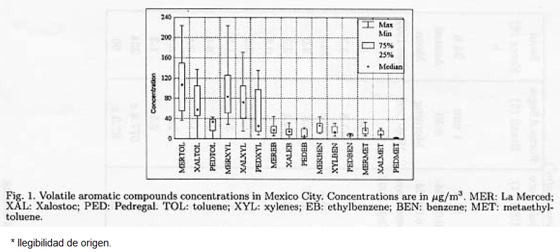 Thirty-three aromatic compounds were detected, and the most abundant species in the three sites were in decreasing order: toluene, xylenes (ortho, meta and para isomers), followed by 1,2,4 trimethylbenzene, benzene, ethylbenzeuc, metaethyltoluene, 1,3,5 triinethylbenzene, npropylbenzene, isopropylbenzene, and styrene. These species account for 80% of the total aromatic compounds. Figure 1 and Figure 2 show the median, minimum and maximum aromatic compound concentrations in a box plot presentation of the three sites. In all cases the highest concentrations were found In La Merced and the lowest in Pedregal. Benzene was about 6% of the total of volatile aromatic compounds with concentrations up to 30 μg/m3.