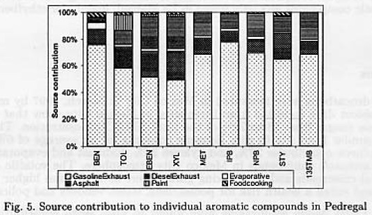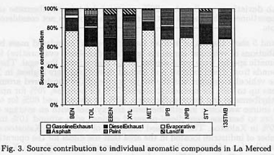 Traditionally, the CMB model has been, applied in many cities to determine how several sources contribute to the presence of NMHC (Watson et al., 2001). In this study, the CMB model was used to determine the source apportionment to the presence of individual volatile aromatic compounds go it would be possible to establish specific control measures for each specific aromatic compound.