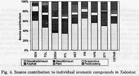 In addition to gasoline exhaust emissions, about 20% of toluene was emitted by diesel exhaust sources, 13% in average by asphalt operations, and up to 11% by architectural coatings and graphic arts. As well as benzene, the major contribution of gasoline vapors to the concentration of toluene was found in Xalostoc (5.4% vs. 1.5% in the other two sites). In general, the contribution of diesel engines exhaust was very important to the presence of alkylated aromatics, such as xylenes, ethylbenzene and styrene, particularly lit Xalostoc. Metaethyltoluene and 1,3,5 trimethylbenzene had the lowest contributions by this source [up to 8 and 15%), The contribution of evaporative emissions to other aromatic compounds than benzene was less to 5%, while the highest values were found in Xalostoc. Asphalt operations were Important contributors to ethylbenzene, xylenes, 1,3,5 trimethylbenzene, isopropylbenzene, npropylbenzene, and styrene, with average percentages of 25, 24, 21, 18, 18, and 13%, respectively.