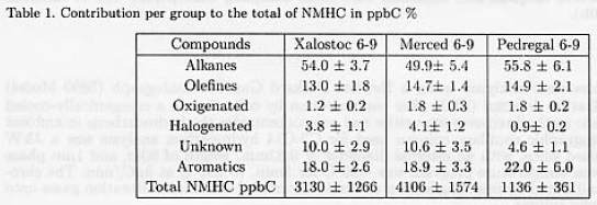 Table 1 shows the content of each type of organic groups at the three sites. Total volatile aromatic compounds accounted for 18 to 22% of the total NMHC, In average, La Merced was the most polluted area followed by Xalostoc. Pedregal had concentrations lower than one third of the other two sites, although it presented the highest percentage of aromatic compounds of the total NMHC.