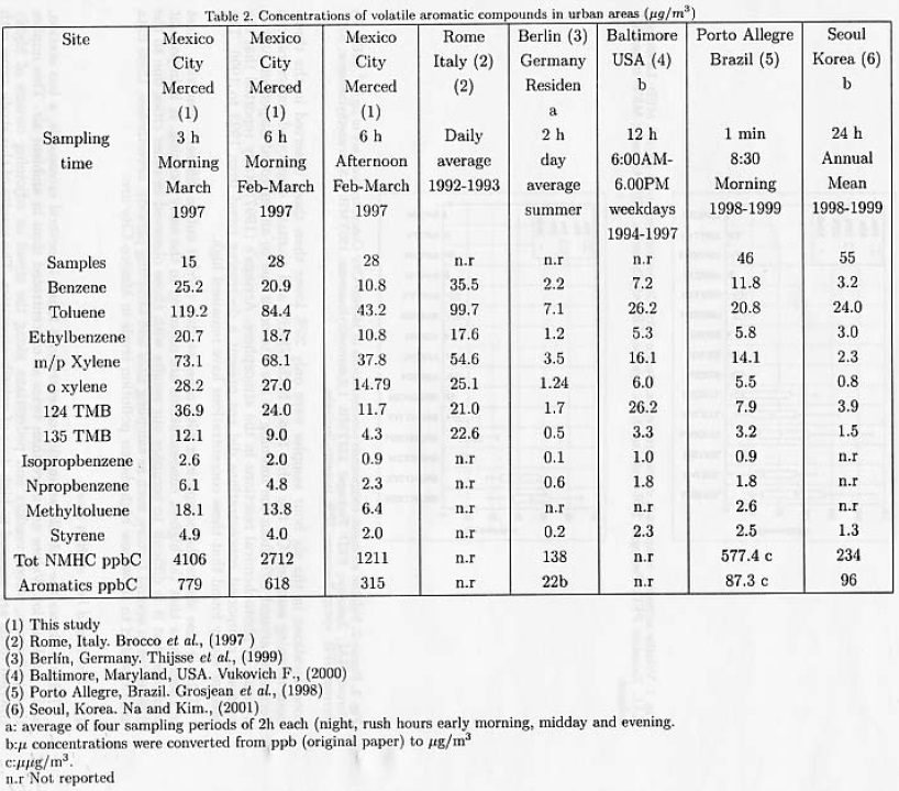 Table 2 also shows the comparison with other studies carried out in different countries. Most of them show that the highest concentrations are observed in the early morning. It is Important to stress that it is difficult to compare our results with those observed in other cities due to the differences in several factors, such as sampling sites and sampling periods; nevertheless, these data are presented to show how high the air pollution levels in Mexico City are.