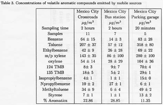 On the other hand, volatile aromatic compounds have been associated to the formation of secondary organic aerosol (Odum et al., 1997). Mugica et al., (2002b) used the maximum incremental reactivity coefficients determined by Carter (1994) to rank different NMHC in relation to ozone formation. Xylenes, toluene, 1,2,4 trimethylbenzener and 1,3-5 trimethylbenzenc ranked within the ten compounds, that play a major role in ozone production in Mexico City. With the aim to control air pollution in Mexico City, the installation of catalytic converters in vehicles has been mandatory since 1991. As a consequence, lead in gasoline was eliminated antl aromatic content increased. The content of aromatics in gasoline fuels on volume base has been controlled since 1994 to a maximum of 25%, and the content of benzene to a maximum of 1%. A gasoline vapors recovery program at gas stations has been implemented in Mexico City. Nevertheless, the atmospheric concentration of benzene in Mexico City has been reported as one of the highest in the world (Arriaga et al., 1997). In 1995, the Federal District Administration conducted some studies in a specific site of Mexico City using a differential absorption spectrometer (OPSIS), founding a mean level of benzene of 45 μg/m3/.