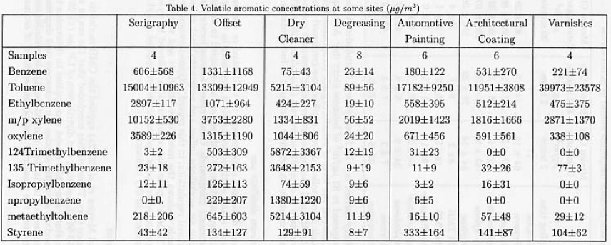 The use of solvents and distillates of petroleum in residential or commercial areas is of environmental concern because many of them are handled carelessly in the open air where not only workers, but also pedestrians, inhabitants and vendors are exposed to the emission of toxic vapors with a high content of aromatic compounds. Other closed sources located in residential areas such as dry cleaners and graphic art workshops (offset and serigraphy) lack emission control equipment because there are no national regulations; in this regard, adjoined owners or neighbors are exposed to NMHC emissions. Table 4 shows the mean concentrations and standard deviations found in these kinds of settings. Toluene's measured concentrations followed by xylenes' were very high in the graphic art workshops and where paint and varnishes are applied. Alkyl and trimethylbenzenes had the highest concentrations in dry cleaners.
