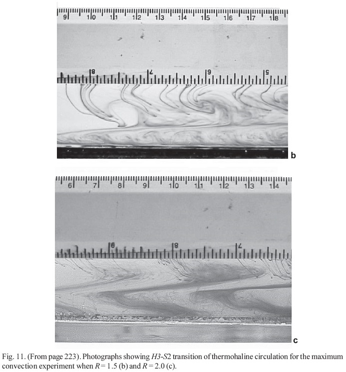 The primary finding was that these experiments have produced the anticipated multiple states in a real physical system and have confirmed the principal predictions of the theory: two steady states and Stommel transitions can exist for the same boundary conditions. The S-mode of circulation (in notation by Whitehead J.A.) was observed as a laminar 3-layer flow system. The T-mode was realized as a more turbulent 2-layer circulation (see Fig. 12 in Whitehead et al., 2003). The transitions between these modes were seen abrupt. The multiple equilibrium was observed in a series of laboratory tests when external forcing parameters had approximately the same values. The space of control parameters (for temperature 15 °C < ΔT < 25 °C and for salinity 8‰ < ΔS < 10‰ differences) for the multiple equilibria experiments found for the box model configuration when the aspect ratio: ε = π H / L ≈ 1. The ratio of the temperature and salinity time-scales were estimated in the experiments as δ = 1/3.