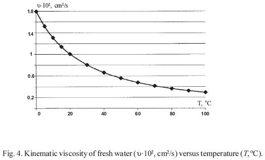 The coefficients of the heat and salt diffusivities were accepted as kT=10-3 cm2/s and kS = 10-5 cm2/s according to Schmitt (1994). It is known that the kinematic viscosity of fresh water decreases when temperature increases and approaches the exponential law V = Ae- B T + C with the constants A = 1.5326×10-2, B = 3.3990×10-2 and C = 0.2402×10-2 (the Andrade equation, see Potter and Wiggert, 1998). Thus, in a series of experiments, the coefficient of kinematic viscosity was changed as 0.54×10-2< V < 1.00×10-2 cm2/s with the characteristic value V = 0.89×10-2 cm2/s for room temperature (Fig. 4). It is evident that salinity increases viscosity. Unfortunately, dependence of kinematic viscosity of sea-water upon salinity is less known from the literature.