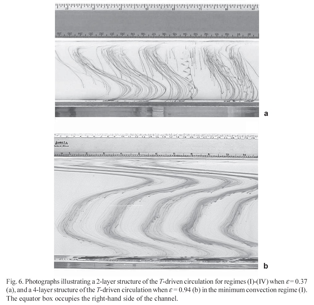 The experiments (I)-(IV) with combination of boundary conditions at different elevations have shown that temperature driven circulation in all these runs for the SCP (H = 6 cm) had a symmetrical 2-layer structure with surface water moving from the equator to the pole box (Fig. 6a). Such kinds of 1-cell motion with water descending at the polar box and rising at the equator box were reported practically in all theoretical models.