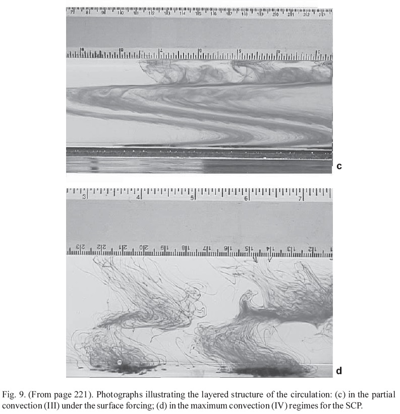 Partial convection regime (II). The flow patterns observed in this regime under the bottom forcing were similar to those previously discussed for the minimum convection regime, i.e. 3-layer system of circulation with a slightly greater Reynolds number (Re = 195). The distinctive feature is that instabilities of the Kelvin-Helrnholtz type were realized at the sharp boundary separating mid depth and bottom flows (Fig. 9b). As can be seen from Figure 8b, temperature distribution was unstable with the minimum value measured at mid depth (RiT = -2 for the lower semiplane), whereas a stable solute distribution (Ris = 28) compensated for this unstable temperature profile. Thus, warm salty water near the bottom was set beneath cold fresh water at mid depth. As noted by Stern (I960), when this water is displaced upward from below, it loses the heat and causes the restoring oscillations and instabilities. This "salt fountain" effect was neglected in Stommel's model supposing that lighter water is only able to float on top of the denser deep water.