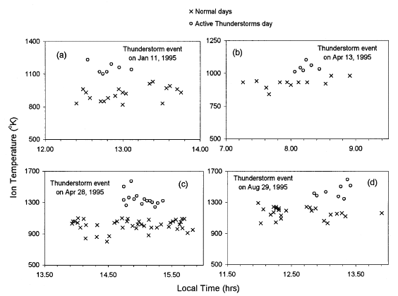 Two events of the active thunderstorm were recorded in Trivandrum. On April 13, 1995 an active thunderstorm was recorded. During the normal days the average electron temperature was up to 1769° K and enhanced up to 2451° K (Fig. 2b) during the sprites associated with the active thunderstorm. The average ion temperature in normal days was up to 925° K and went up to 1045° K (Fig. 3b) during the sprites associated with the active thunderstorm. Thunderstorm activity was also recorded on April 28, 1995. During this event the average electron temperature was enhanced up to 1684° K over the normal days’ average temperature of 1449° K (Fig. 2c). The average ion temperature on normal days was up to 900° K and enhanced up to 1343° K (Fig. 3d) during the sprites associated with the active thunderstorm.