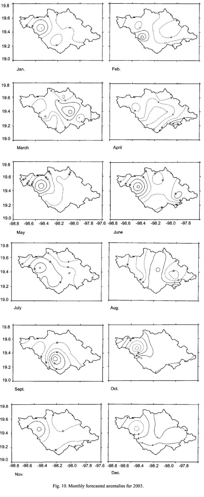 A description of the negative precipitation anomalies forecasted in the State for 2003 is given as follows (see Fig. 9). In April the negative anomaly extends over the center-south part of the state; In June the anomaly covers from north to south and in July only the north. During August the canícula generalizes except for the north-south band, continues during September but it is not present in the south. By October there is a general deficit of precipitation that extends to November excepting the south. By December conditions turn to normal.