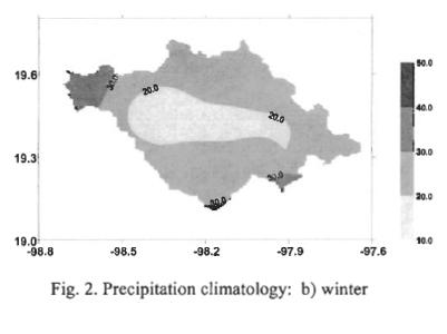 Tlaxcala is the smallest Mexican state and it is located at aproximately 19° N latitude, 98° W longitude as it is shown in Figure 1. Tlaxcala's climate shows great diversity due to its complex orography and different land uses from one region to another. These characteristics result in very different weather regimes among regions that manifest themselves from day to day. However, the climate of the region is, in general terms, modulated by factors of a larger spatial scale like the Intertropical Convergence Zone (ITCZ) and its perturbations, the easterly waves, the trade winds and hurricanes. All these processes contribute an average precipitatation of 400 mm during the summer (Fig. 2a) and an average of 30 mm during the winter (Fig. 2b). Their influence may last for a season or even a year. It is also clear that the state of Tlaxcala has only one good season for rainfed agricultural activities.