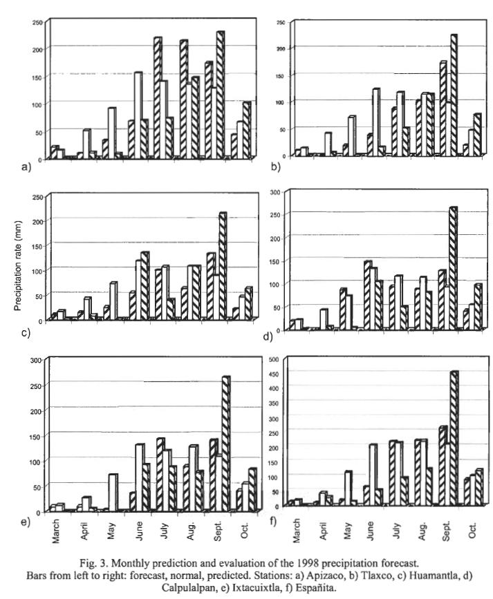 For the summer of 1998 the weakening of the El Niño (1997-1998) was foreseen for July or August giving way to the appearance of La Niña. Based on previously estimated diagnostic relationships it was possible to establish that as long as El Niño conditions prevailed, a drought (very dry conditions) would be present, but as soon as the El Niño conditions disappeared, precipitation would recover. Based on this forecast, in March of 1998, predictions of precipitation anomalies were issued for the State of Tlaxcala (at a local level) with the purpose of giving time to farmers to plan their activities. The results of these forecasts were very encouraging in view of the comparisons to what actually occurred during the summer of 1998. In every case the forecast was adequate, the delay in the initiation of the rains and abundant precipitation during the second half of the summer as was later observed.