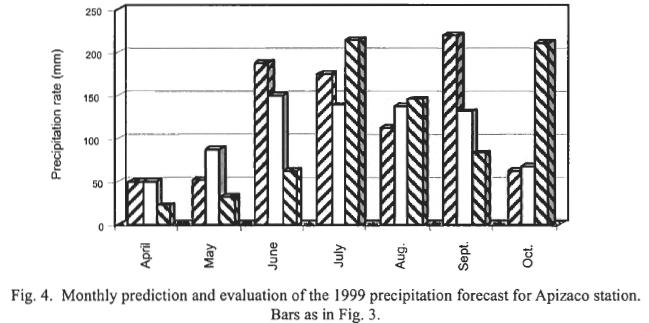 Under El Niño conditions, the forecasts show a better skill due perhaps to the strong coupling between the ocean and the atmosphere that results in important modifications of the circulation at the global scale affecting regional and local conditions. Table 1 summarizes the results of a simple evaluation of the forecasts, consisting in assigning a one when the forecasts coincided with the observation and a zero otherwise. It is clear that the forecasts turned better (in general) for the first semester than for the whole year. For Apizaco two-weekly forecasts were prepared as petitioned by the producers. The results show that useful forecasts can be produced with similar skill to the monthly ones.