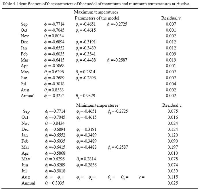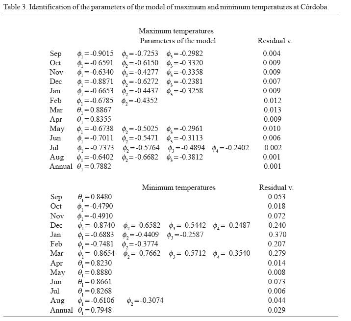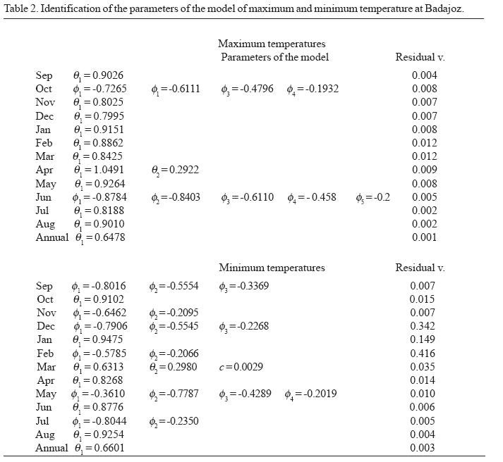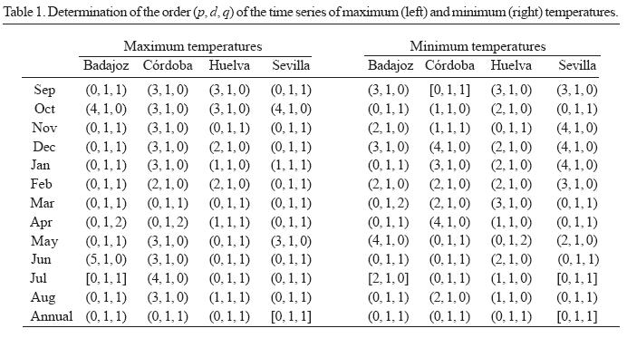 The orders (p, d, q) for each monthly series have been obtained. The series of minimum temperatures with one order of derivation and logarithmic transformation have been fitted to pure moving average (MA) models (38%) -above all MA(1)- to autoregressive (AR) models (58%) -mostly AR(2)- and to some mixed (ARMA) models (4%). The maximum temperatures fit principal moving average models MA( 1), with very similar monthly values for Badajoz and Sevilla, whereas at the Córdoba observatory, the predominating models are autoregressive, AR (3).