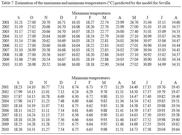 As a result of the methodological process described above (Tables 6, 7, and 8) the monthly predictions of maximum and minimum temperatures at the observatories of Badajoz, Sevilla, and Córdoba until the year 2010, from ARIMA models, are included. We should point out that expression of the annual predictions in hundredths of °C is only of mathematical interest for observing variations between years; from the point of view of climatic significance, the precision for temperature is of tenths of a degree, as in the records of the series.