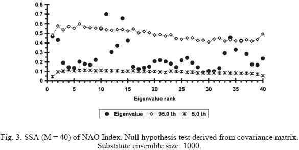 A SA was calculated for SOI (Fig. 1) and NAO index (Fig. 2), looking for significant periodicities. For both magnitudes, the spectra show few peaks above noise, with no coincidence between them. Cycles found in NAO index correspond to periods of 8.0, 5.8, 2.4 and 2.2 years, whereas those found in SOI correspond to 6.4 and 3.5 years. The only common characteristic is the high degree of red noise. This result is slightly different to that reached by García et al. (2000) who found a significant common oscillation of 6-8 years that represents about 20% of the SOI variance and about 25% of the NAO variance. However these authors advised of the limitations of the results due to the length of the used series. Results obtained using SSA for NAO index and SOI are shown in Table 2 for the first eigenvalues. The lack of coincidence between the indices is also evident in this case, although in some cases the difference is small. Obviously, the oscillation modes in NAO and SOI are not the same. Applying the Monte-Carlo method to the NAO index (Fig. 3), it is found that none of the cycles is significant at 95% significance level, although the significance of the 8 years cycle is good enough to consider it as a real cycle. This result is clearly in agreement with other studies looking for spectral peaks in the NAO series (e.g. Pozo-Vázquez et al., 2000).